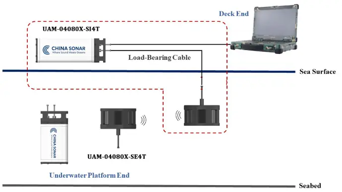 The UAM-04080X-SI4T utilizes acoustic wave transmission within the 4–8 kHz frequency band to achieve underwater communication. Digital data is converted into acoustic signals through a modulation process, transmitted through seawater, and then received and demodulated by a remote unit. The system employs adaptive signal processing to maintain stable communication performance under varying underwater conditions such as noise, temperature, and salinity. With a built-in low-power duty control module, the device efficiently manages energy consumption, making it suitable for long-term deployment on seabed bases and buoy-based observation platforms.