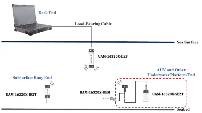 The UAM-16320X-IE2T operates as a shallow-water underwater acoustic modem, transmitting and receiving acoustic signals within the 16–32 kHz frequency band. The device supports half-duplex communication, switching between transmit mode and receive mode to ensure reliable mid-range data links up to 3 km.